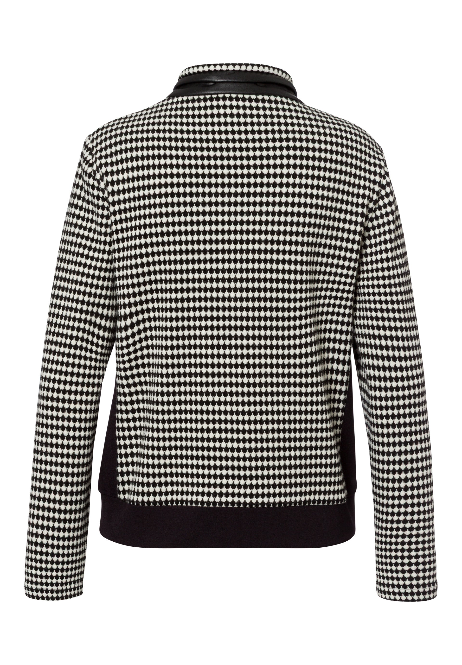 This Frank Walder slim fit jacket features a classic houndstooth pattern with refined leather trim on the collar, adding a touch of elegance. Its tailored silhouette and jersey side panels ensures a sleek, modern look, perfect for elevating your smart-casual wardrobe with understated sophistication.