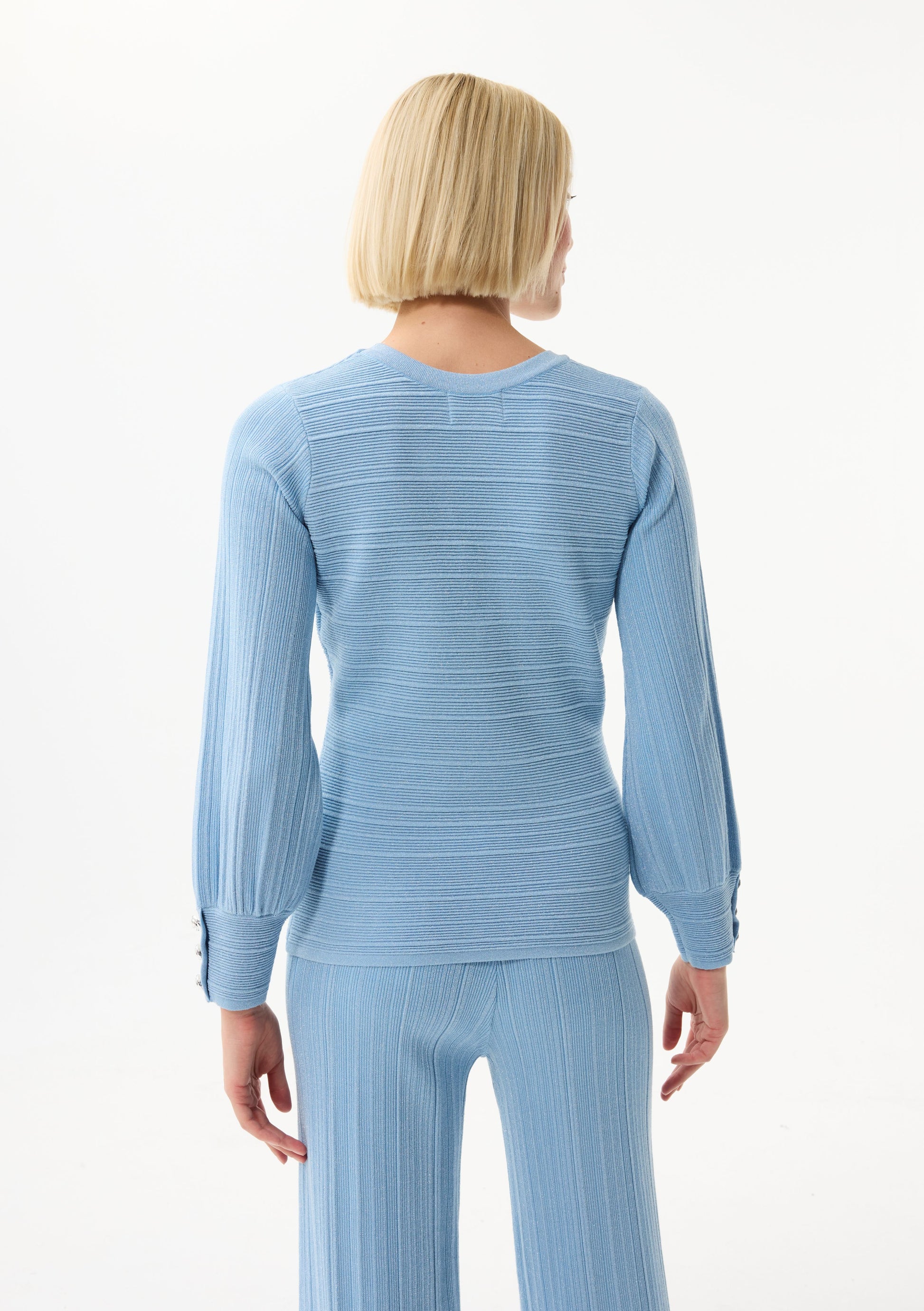 Elevate your wardrobe with the LEO&UGO Blue Lurex V-Neck Knit. Crafted from stretch fabric, this refined piece offers comfort and a flattering fit. The elegant ice blue shade is enhanced by a subtle lurex shimmer, while the long sleeves and deep V neckline add timeless sophistication. Distinctive big button details complete the look, making it perfect for both polished office wear and stylish evenings out.