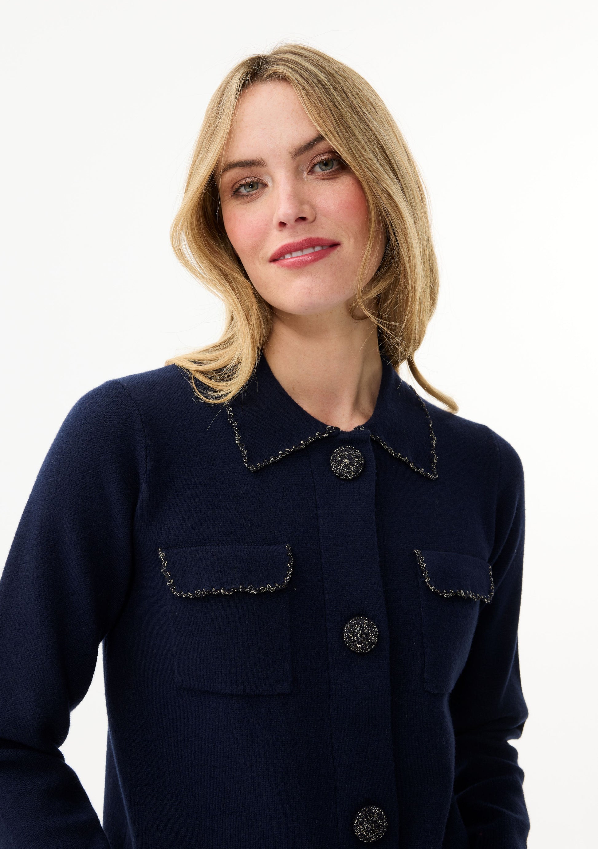 Elevate your style with the LEO&UGO Navy Knit Collared Cardigan, featuring shimmering trim and buttons for a touch of refined elegance. The classic collar and round neck design complement full-length sleeves and a regular fit, offering both comfort and a polished look.