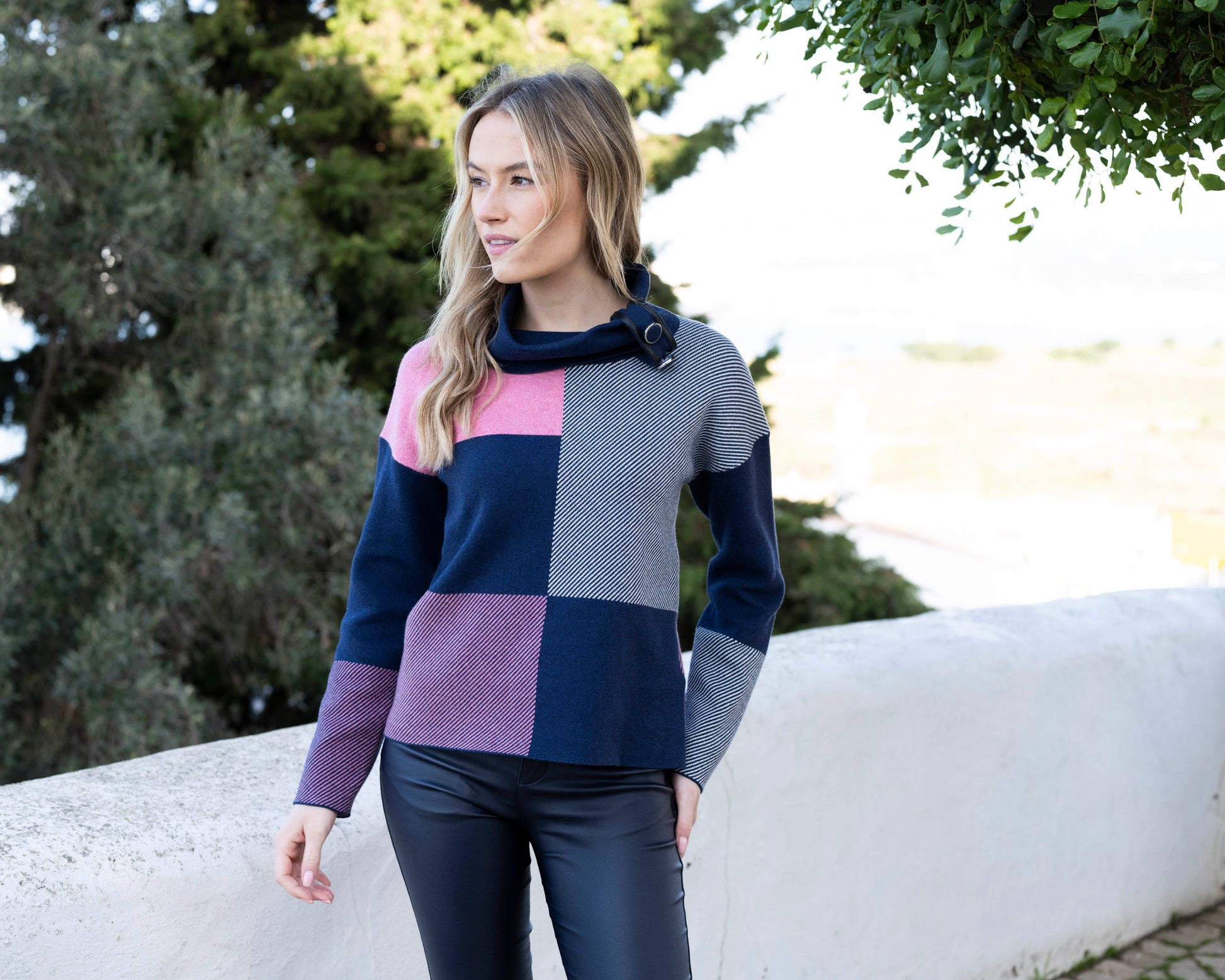 Elevate your wardrobe with the Marble Pink and Navy Cowl Neck Knit Jumper, featuring a sophisticated patchwork effect that adds subtle visual interest. This relaxed-fit jumper ensures all-day comfort while the refined leather detail on the cowl neck delivers a touch of understated luxury. Perfect for layering or wearing on its own, it combines style and ease effortlessly.