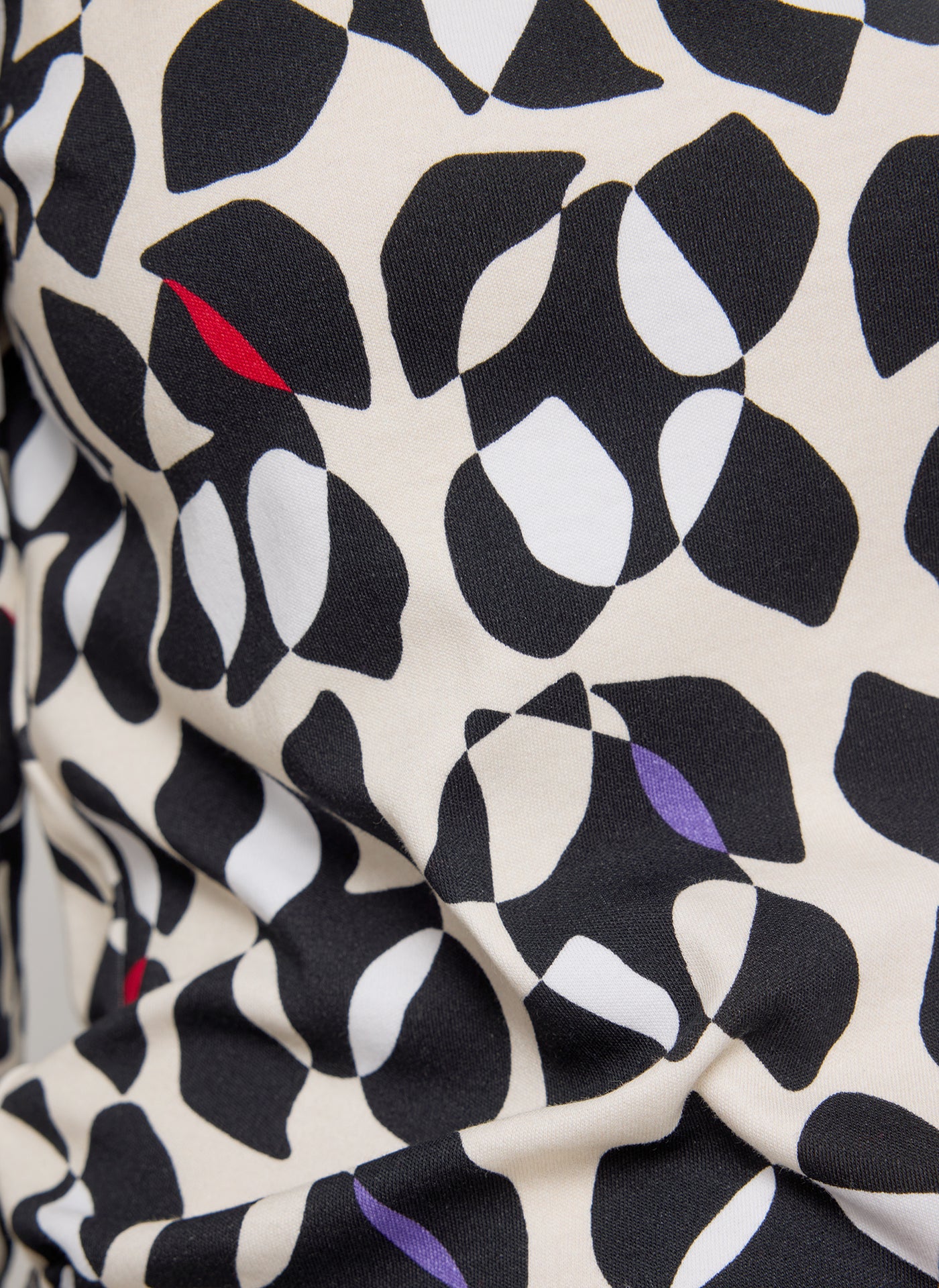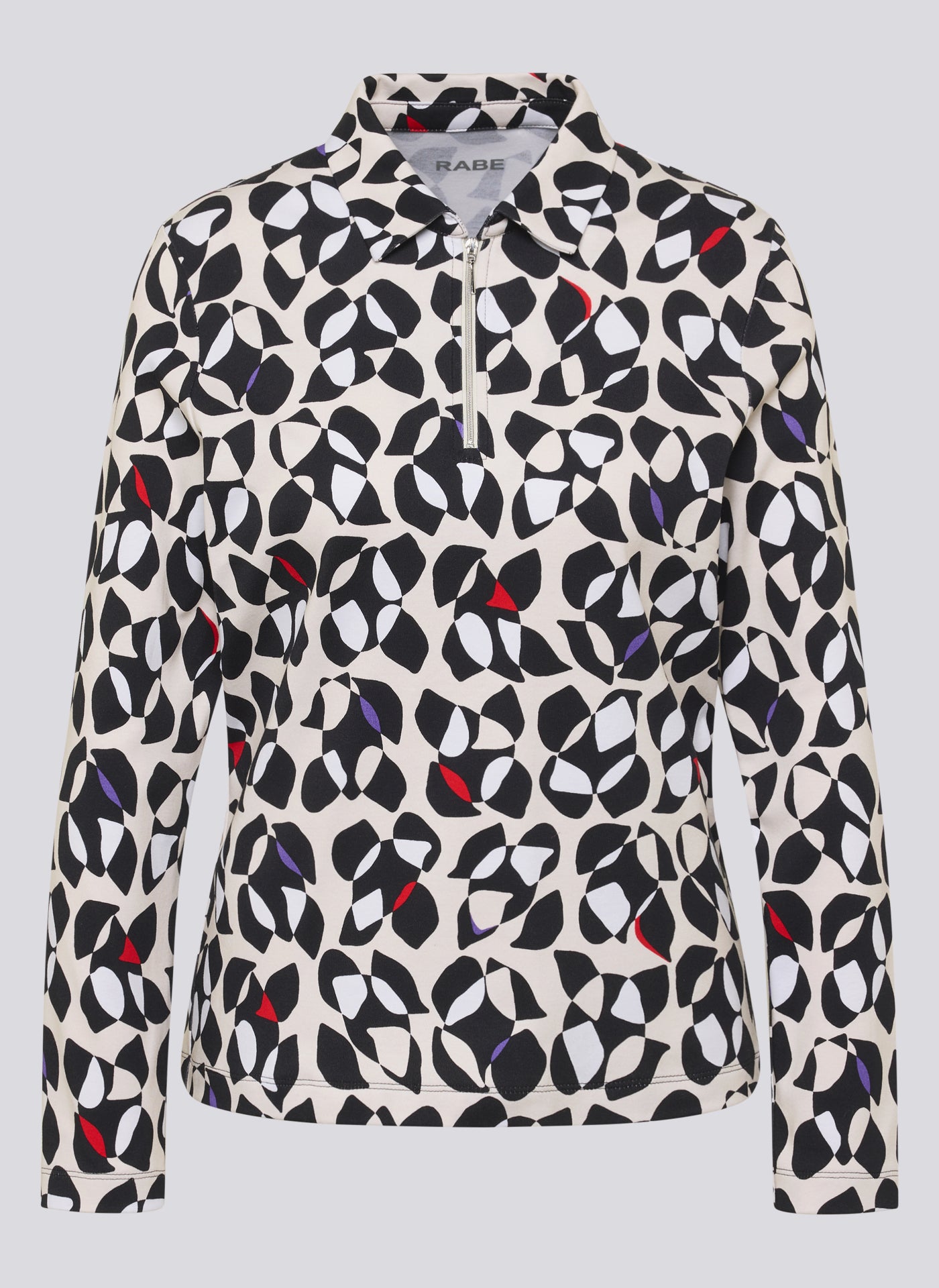 The Rabe Black Multi Leo Poloshirt features a sleek, fitted design crafted to enhance your silhouette. Made with long sleeves for added coverage, it combines functionality with modern style through its bold geometric print. The front zip adds a contemporary twist, allowing adjustable ventilation and easy wear, perfect for dynamic, fashion-forward wardrobes.
