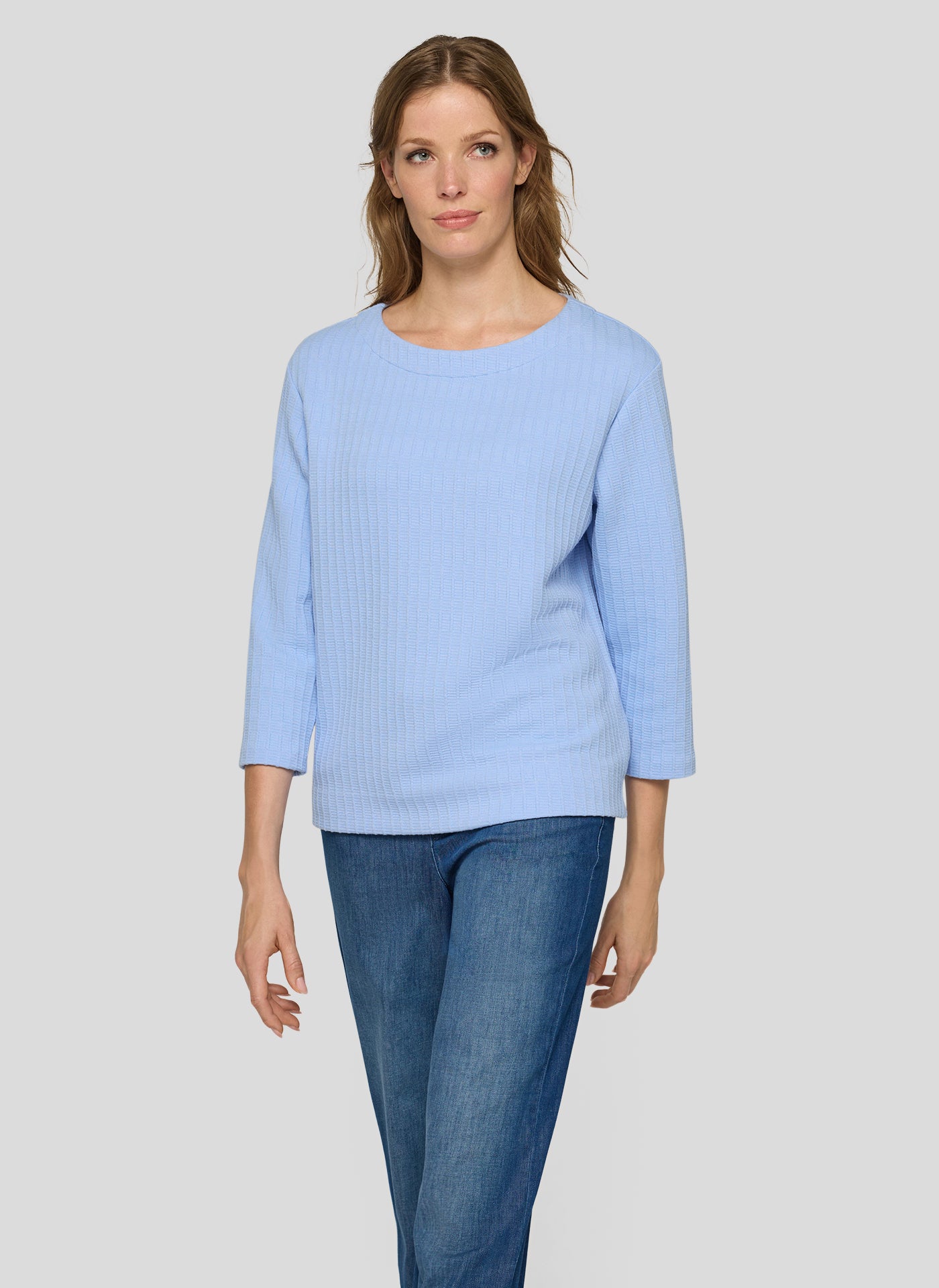Embrace comfort with this pale blue relaxed jumper from RABE. Featuring a classic round neck and practical 3/4 length sleeves, it's designed to move with you throughout your day. The subtle embossed texture adds visual interest while maintaining an effortlessly versatile look.