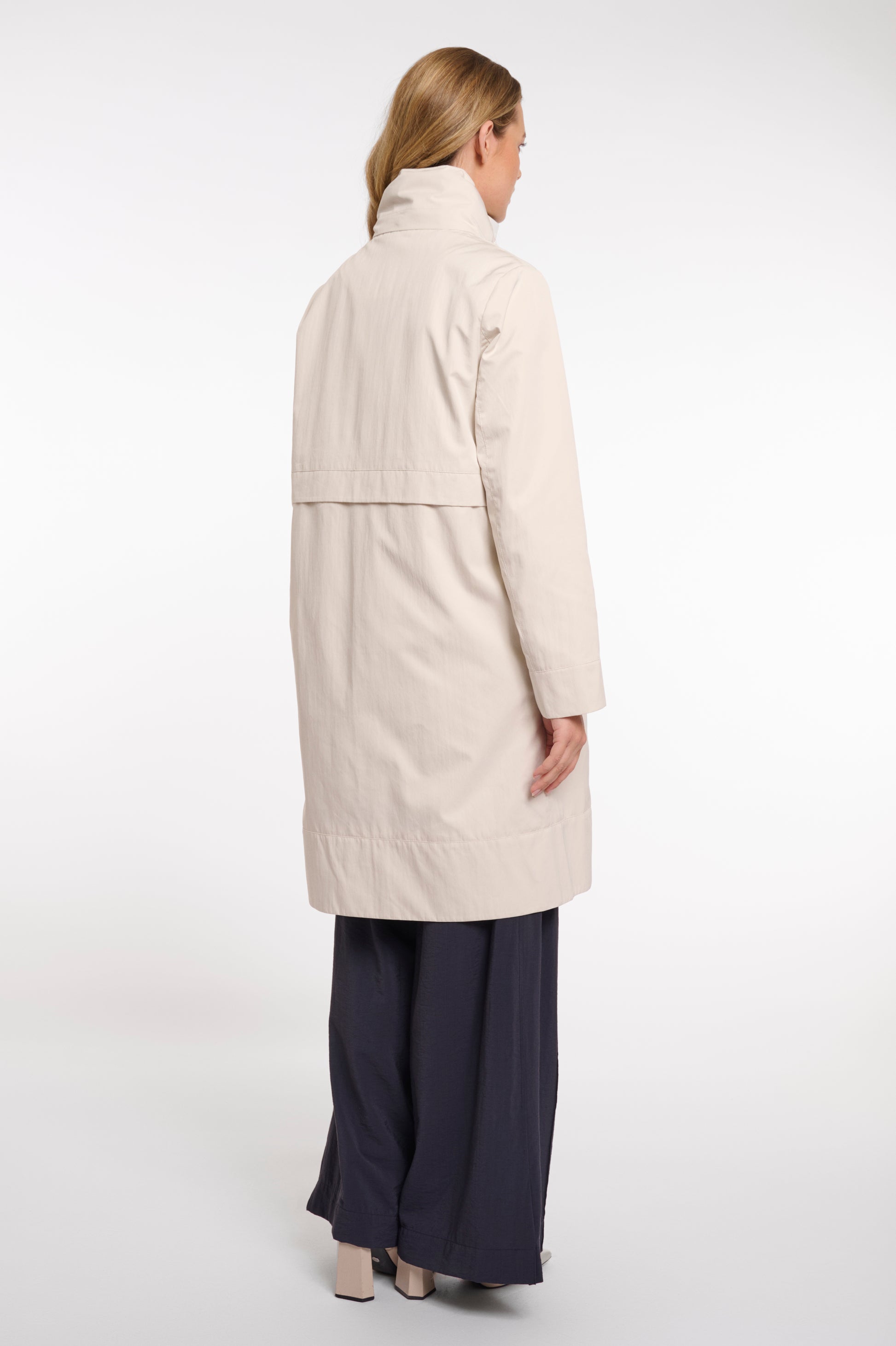 Rino&Pelle Cream Zip Up Parka Jacket combines timeless elegance with practical design. This mid-length parka features a distinctive high stand-up collar and refined front zipper that stops above the hem for a contemporary edge. Secure front slip pockets with button closures provide convenient storage, while a streamlined wind flap running front to back creates a polished silhouette. Perfect for staying protected in style.