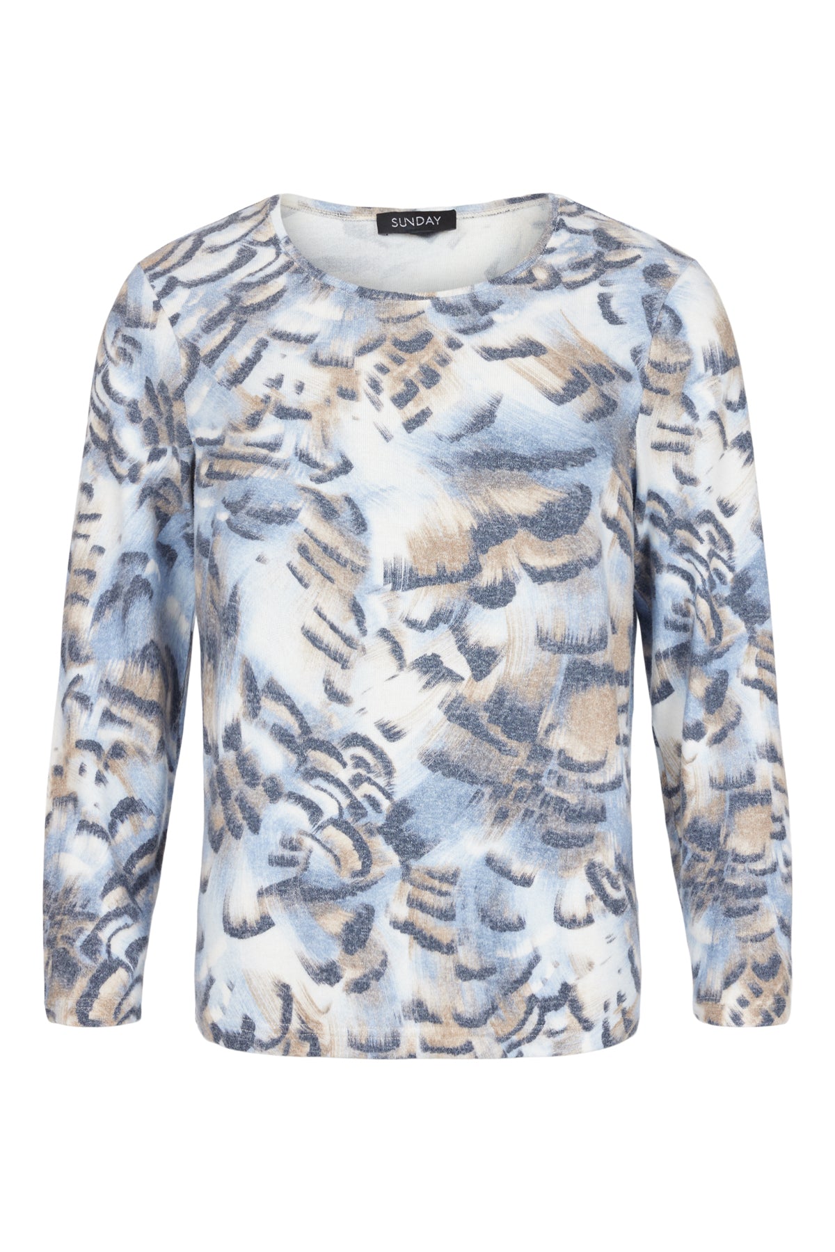 This Sunday Blue Printed Knit Top combines a fine knit fabric with a soft blue and tan print, creating a timeless, sophisticated look. Designed with a round neckline and bracelet-length sleeves, it offers refined comfort ideal for everyday elegance.