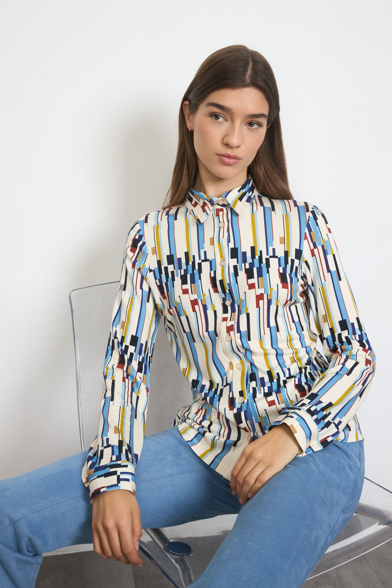 This classic button-up shirt features a refined blend of greens, blues, and subtle espresso shades set against a cream background. Its harmonious palette offers a sophisticated touch, perfect for elevating both casual and formal ensembles with understated elegance.